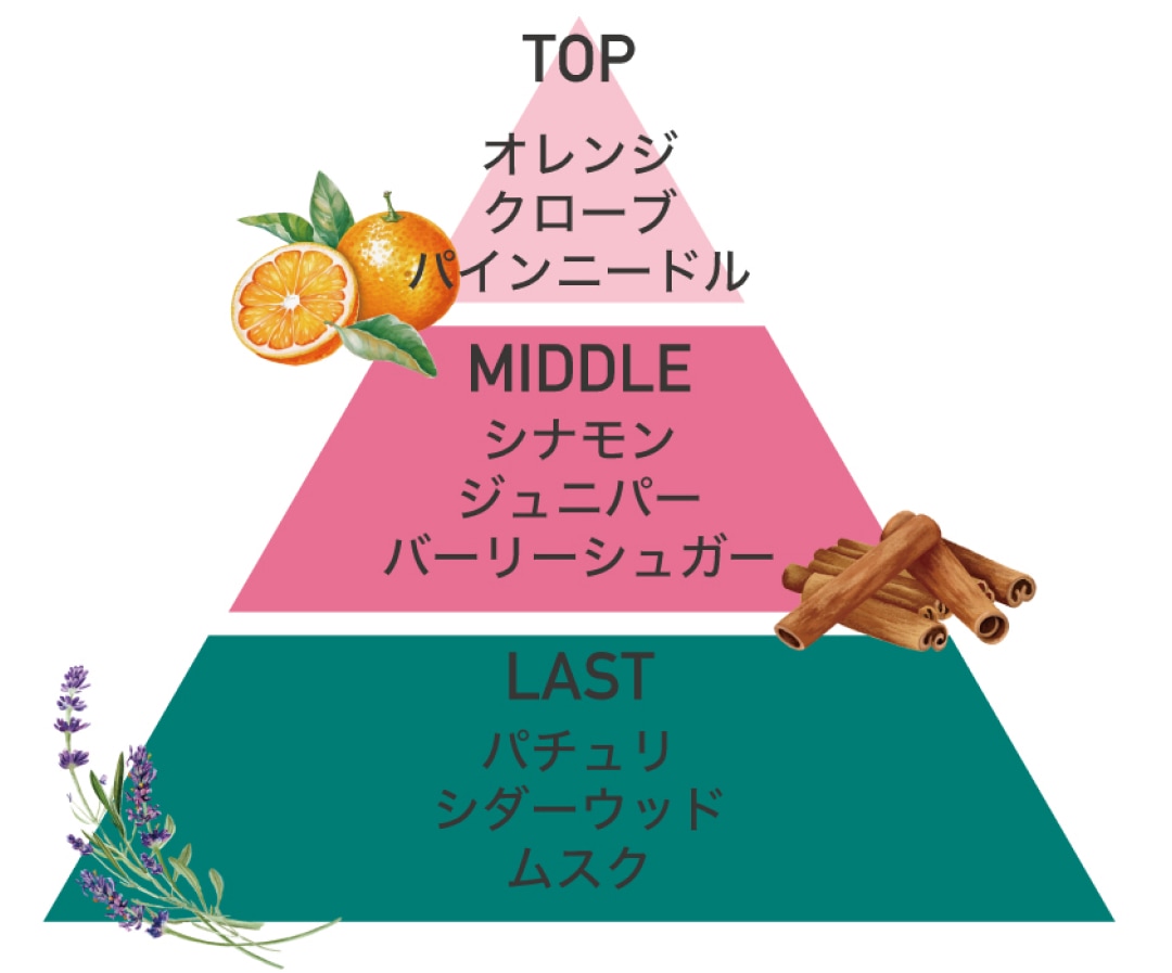 やさしいオレンジとジュニパーのウッディな香りに、ホリデーを彩るお菓子のようなシナモンのスパイスがふんわりと重なります。ほろ苦くもやさしい甘さが、冬の午後をあたたかく包み込むぬくもりの香り。