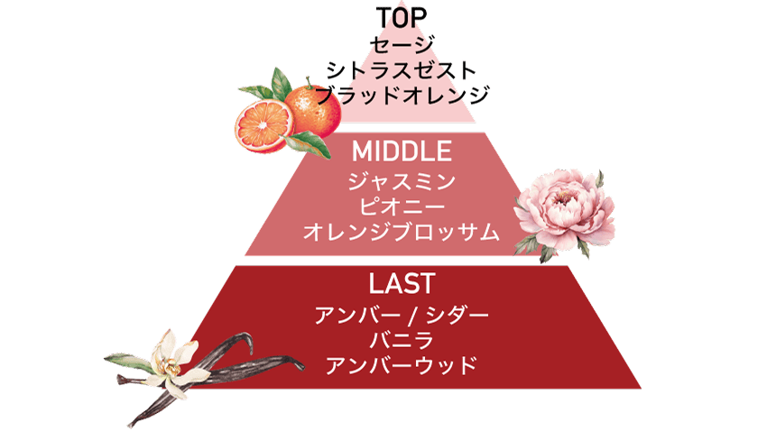 甘さと強さを兼ね備えたバニラとアンバーウッドの深みをベースに、セクシーさが香るセージ、ブラッディオレンジが寄り添い、ジャスミンとピオニーが女性の心にもそっと寄り添います。
